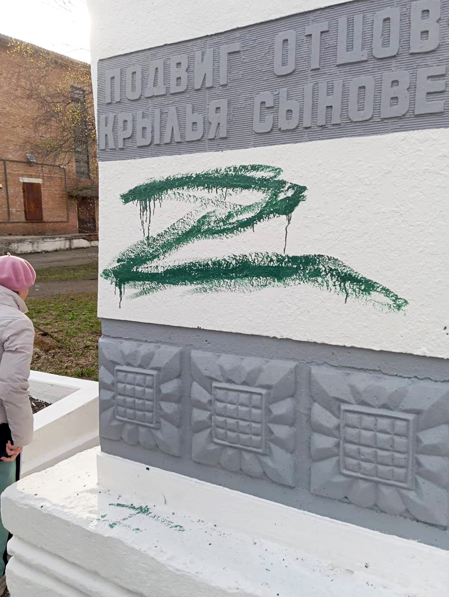 На опубликованных изданием «Подъем» снимках видно, что на памятник ветеранам Великой Отечественной войны зеленым цветом нанесена буква Z.