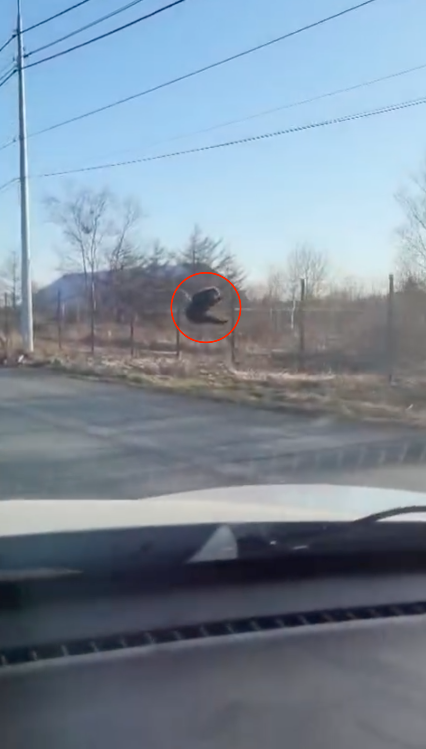 Зверя сняли на видео в тот момент, когда он уже перелез обратно через ограду аэродрома и убежал в лес. При этом медведь оставил вмятину в том месте, где врезался в ограду, и сильно погнул ее верхнюю часть.