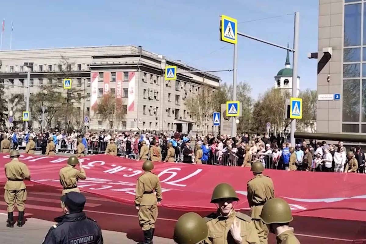 В Иркутске военнослужащие на параде Победы развернули гигантскую копию Красного Знамени. Об этом сообщает Telegram-канал Babr Mash.