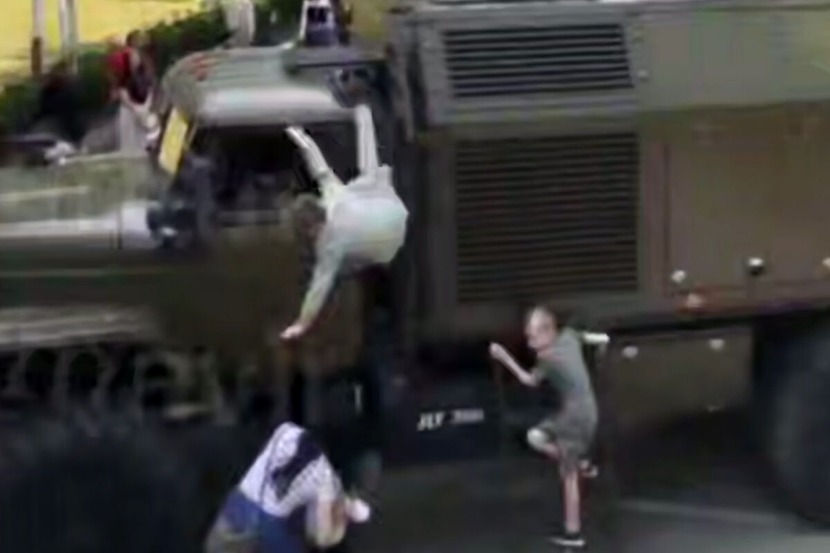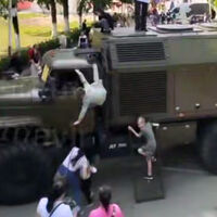 Инцидент произошел в городе Армавире на выставке военной техники. На кадрах с места происшествия видно, как дети ползают по большегрузу, однако в какой-то момент один из малолетних не удержался и упал с крыши кабины на асфальт. Информации о состоянии ребенка не поступало.