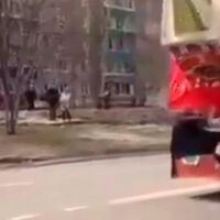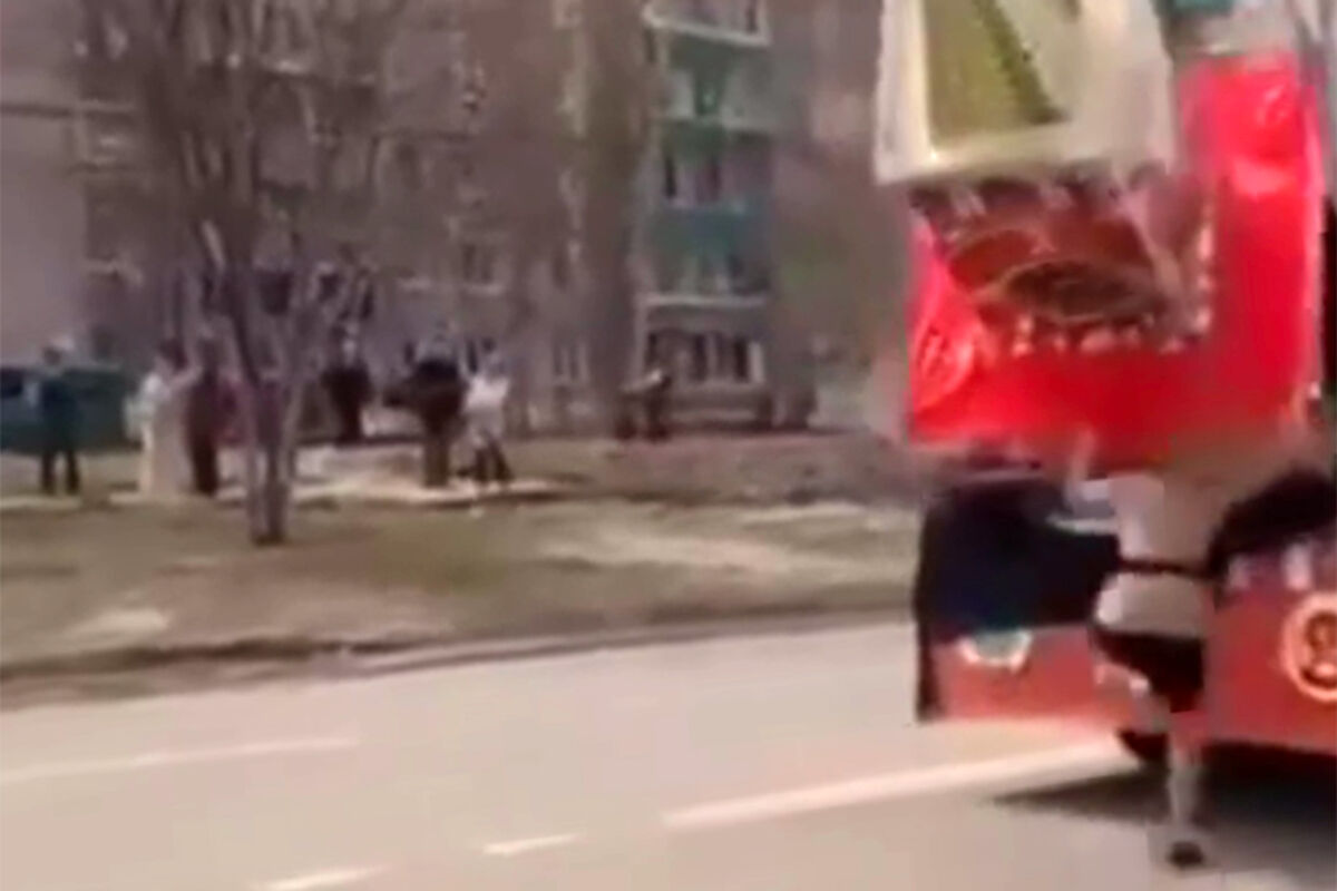Стоящая в багажнике грузовика конструкция зацепилась звездой за висевший над дорогой трос с флагами и повалилась. Девушка рядом не смогла удержать равновесие и упала на асфальт, после чего макет рухнул прямо на нее. Какие травмы получила пострадавшая, не уточняется, однако при падении ей удалось смягчить урон, подставив руку.