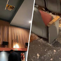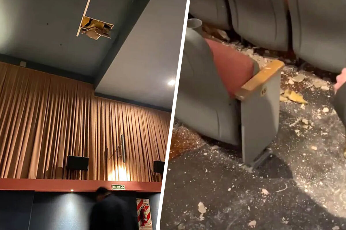 На опубликованных в соцсетях видео видно огромную дыру в потолке кинозала , а также строительный мусор, разбросанный по полу и проходам между креслами.