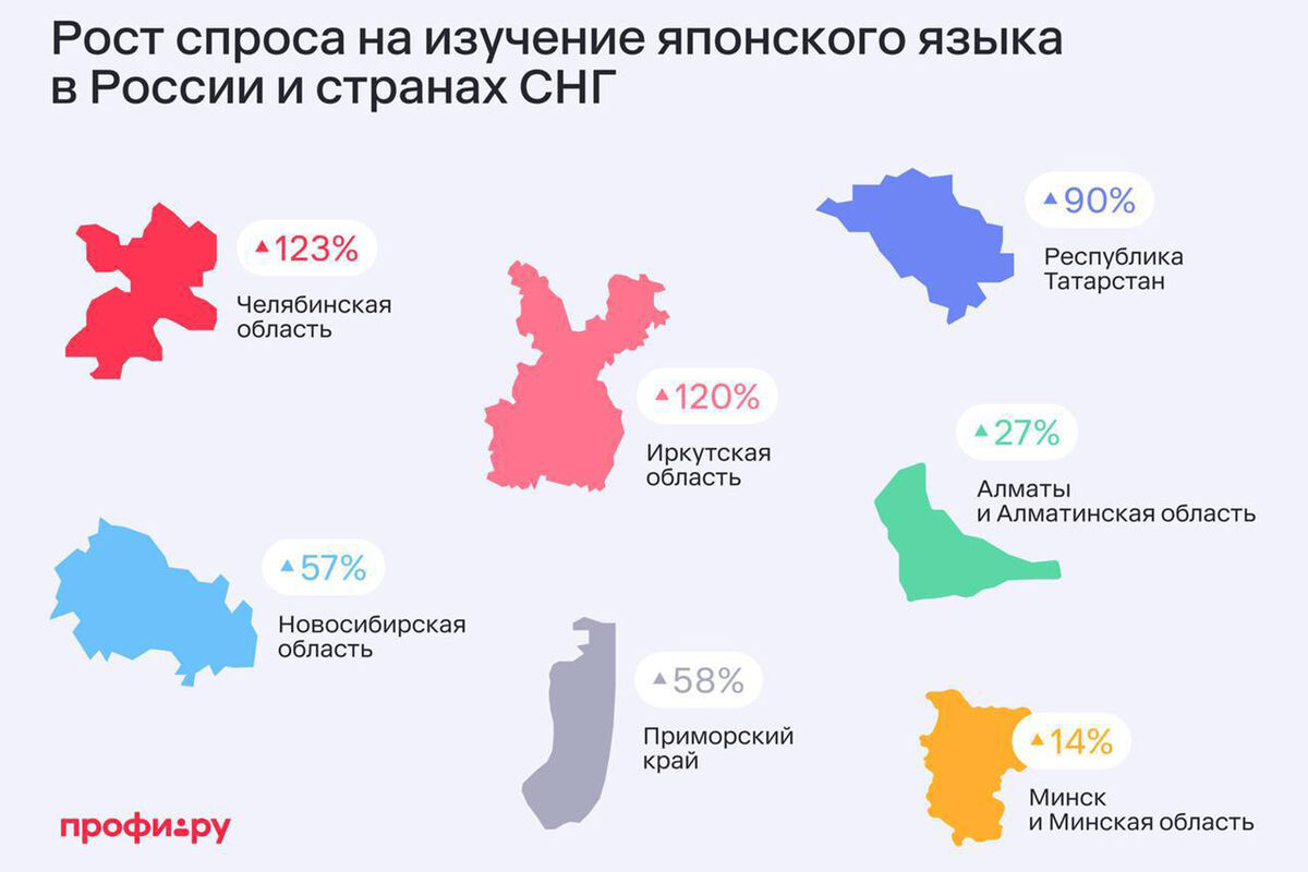 В других регионах присутствия Профи.ру также был зафиксирован рост спроса на услуги репетиторов японского языка. В Алматы и Алматинской области рост составил 27%, а в Минске и Минской области — 14%.
