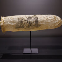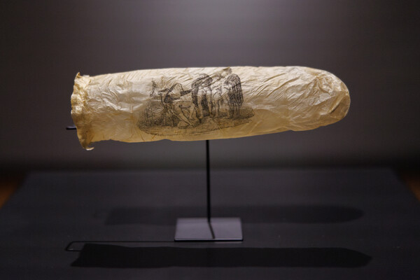 Этот исторический артефакт, предположительно изготовленный из аппендикса овцы около 1830 года, был куплен за €1000 евро на аукционе в Харлеме в ноябре 2024 года. На презервативе выполнена эротическая гравировка, изображающая частично раздетую женщину, указывающую на мужские гениталии трех мужчин.
