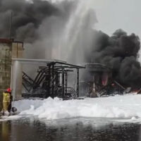 По информации ведомства, пожар возник на территории промышленного предприятия. Там горят установки по производству битума общим объемом 200 кубометров. К месту был направлен пожарный поезд.