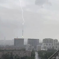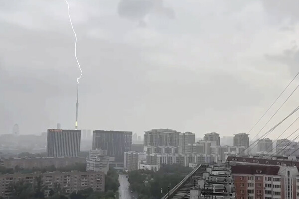 На одном из роликов, снятых москвичами, можно увидеть, как молния бьет в одну из самых высоких точек города — Останкинскую телебашню.