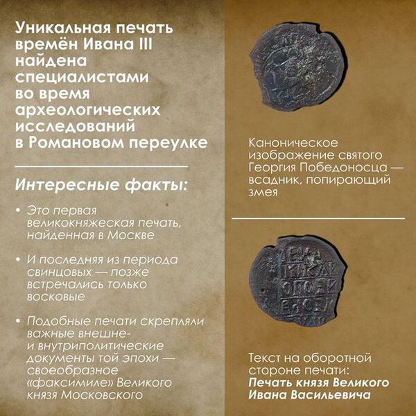 По словам Собянина, печать нашли в культурном слое первой половины — середины XVI века, недалеко от Церкви Знамения на Шереметевом дворе, где идут масштабные раскопки. С одной стороны сохранилось изображение святого Георгия Победоносца, а с другой — надпись «Печать князя Великого Ивана Васильевича». Этой печатью скрепляли важные политические документы той эпохи, уточнил мэр.
