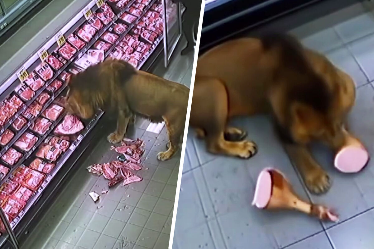 Зверь разгромил витрины, стащил несколько кусков мяса и плотно пообедал. Специалисты центра охраны дикой природы вывезли льва в безопасное место и выпустили на волю. Отмечается, что хищник не проявлял агрессии к людям.