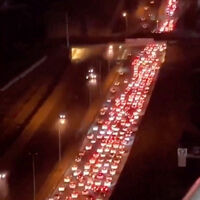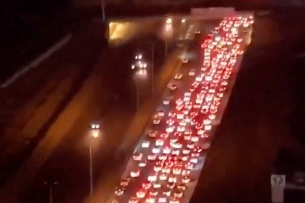На предоставленной видеозаписи видно, как тысячи машин стоят вплотную на дороге. Камеру очевидца слепят фары автомобилей, которые выстроились в шесть рядов.