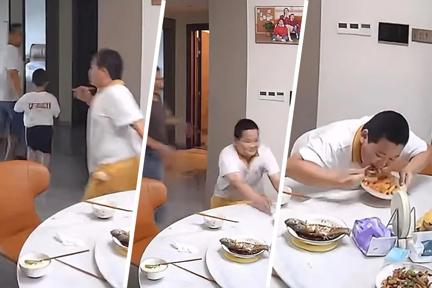Однако старший сын (его имя не называется) сначала последовал за ними, но затем неожиданно развернулся и побежал обратно к столу - чтобы взять несколько блюд. Несмотря на обеспокоенные крики отца, мальчик решительно схватил тарелку с жареным луком, горошком и свининой, а также миску с рисом перед тем, как покинуть дом.