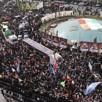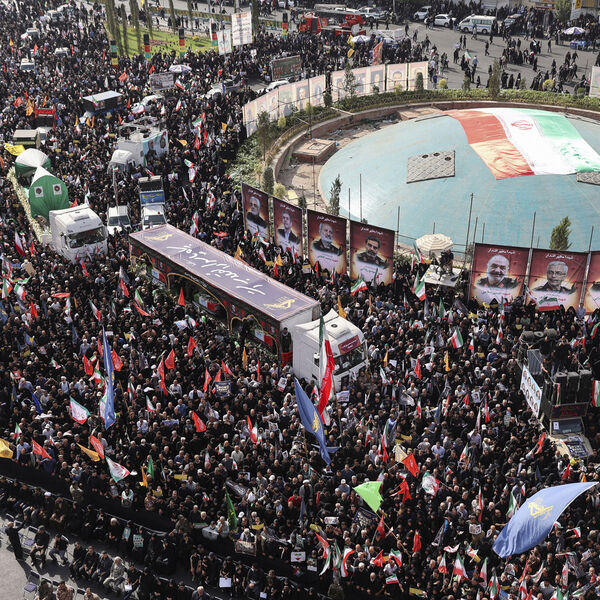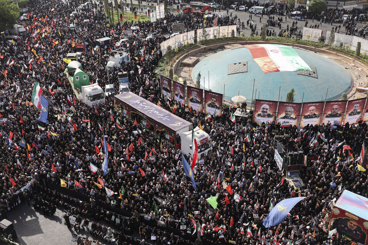 Церемония началась в Тегеране на площади Революции. На похоронах присутствует президент Ирана Масуд Пезешкиан.