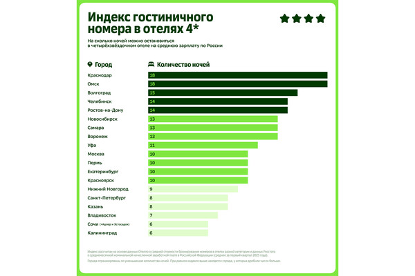 Отелло (сервис бронирования отелей от 2ГИС) рассчитал, сколько ночей в отелях разной категории можно пожить в городах России на среднюю зарплату. Путешественники чаще бронируют отели 4 звезды, а самые доступные в этой категории находятся в Краснодаре, где на среднюю зарплату можно забронировать номер на 18 ночей. В пятизвездочном отеле дольше всего можно пожить в Нижнем Новгороде — 11 ночей, а в Новосибирске в отелях 1-2 звезды или без звезд россияне могут остановиться на целый месяц.