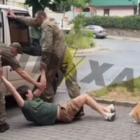 Публикация дополнена видеозаписью, сделанной очевидцами. На ней видно, как двое сотрудников ТЦК вытаскивают из подъезда на улицу сопротивляющегося молодого человека, при этом за ними бежит собака породы корги. Пес залезает на хозяина и пытается помешать удерживающим его мужчинам в форме. Несмотря на это, работникам военного комиссариата удается усадить жителя Львова в машину и увезти его в неизвестном направлении. При этом собака осталась на улице вместе с очевидцами.