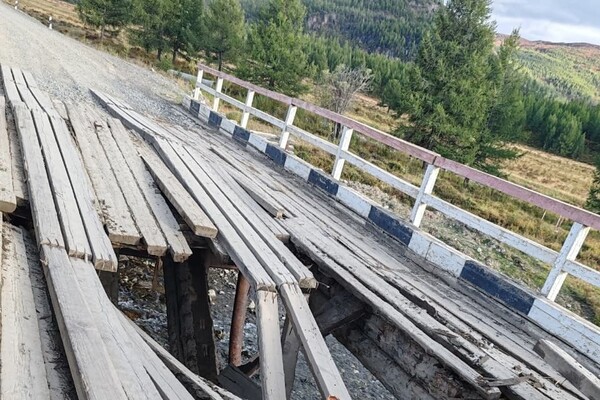 На Алтае в 40 километрах от села Беляши на реке Шипты-кол произошло частичное обрушение деревянного автомобильного моста. Об этом сообщили в администрации Кош-Агачского района республики на странице в соцсети ВКонтакте.