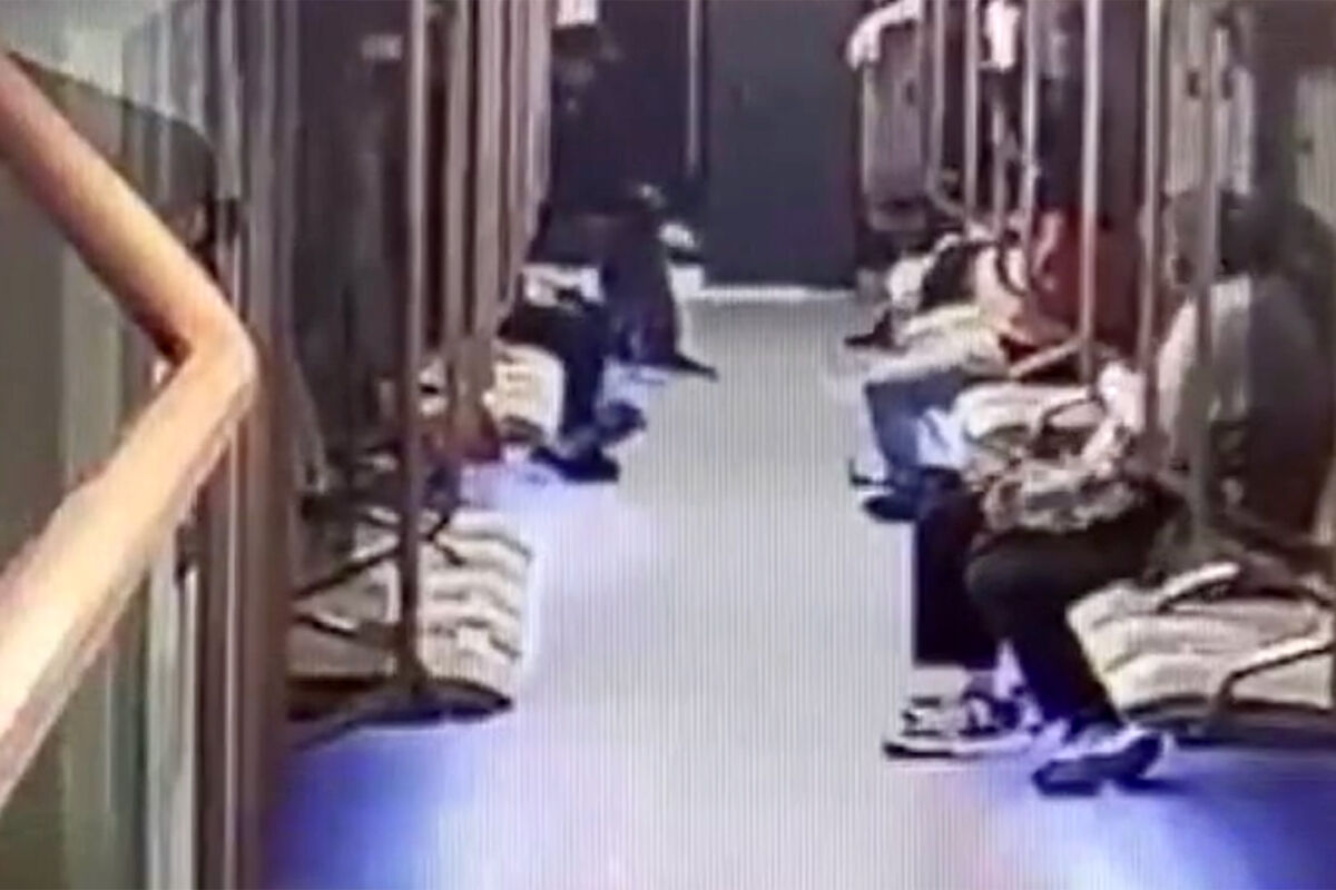 На обнародованных кадрах видно, как мужчина в черной толстовке достает из кармана предмет, похожий на пистолет, и стреляет в ноги напротив сидящего пассажира.