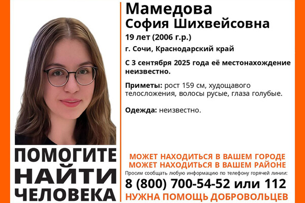 О том, где находится пропавшая София Мамедова, неизвестно с 3 сентября. Рост девушки составляет 159 сантиметров, она худощавого телосложения. Волосы русые, глаза голубые. Во что она была одета в момент пропажи, неизвестно.