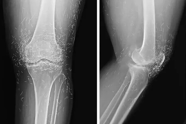 Рентген показал утолщение и деформацию костей, типичные признаки остеоартрита, а также сотни золотых фрагментов, внедренных в ткани вокруг коленного сустава. По словам специалистов, такая практика не имеет доказанной эффективности и несет серьезные риски.