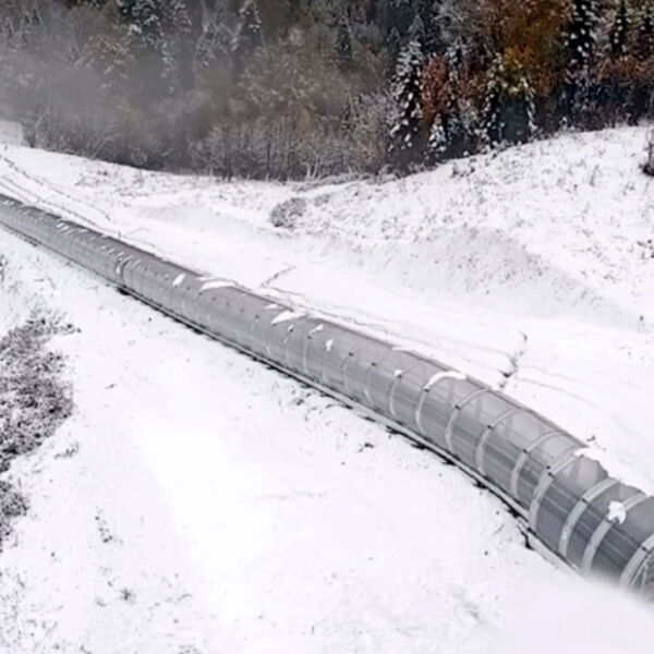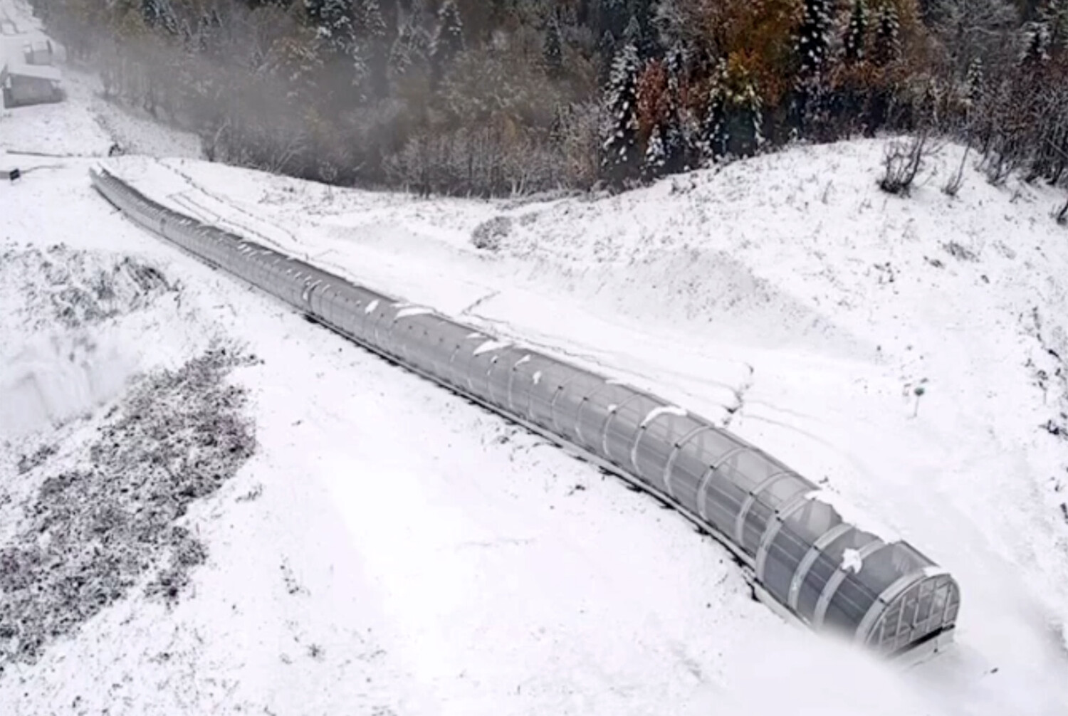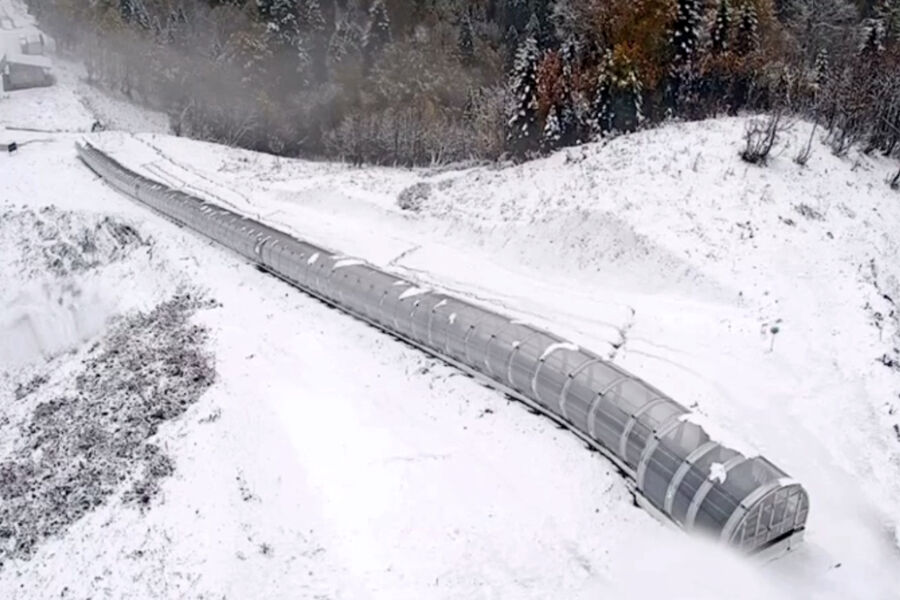 На кадрах видна заснеженная горная местность. Судя по видео, снегопад сопровождается метелью.