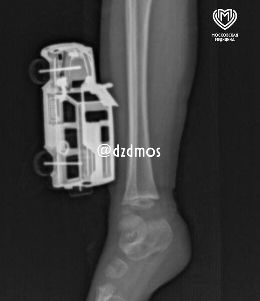 По словам родителей, ребенок прыгнул с кровати у себя дома и неудачно упал на игрушку правой голенью. Машинка повредила мягкие ткани, ее части вошли глубоко и достигли подкожножировой клетчатки.