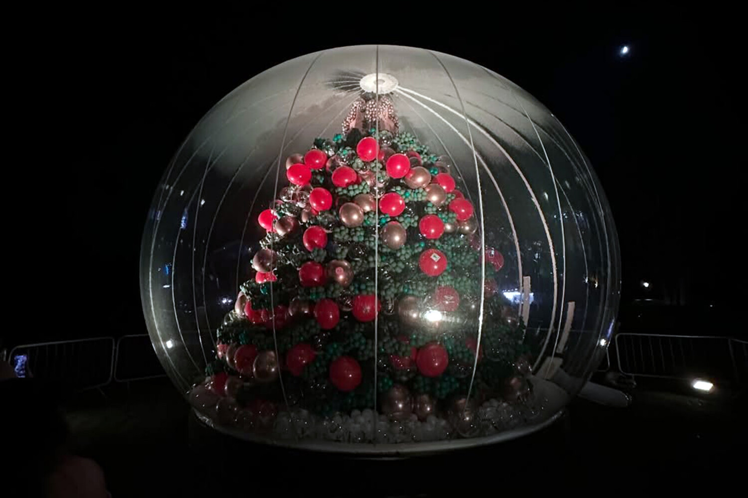 Отель Moor Hall Hotel and Spa в Саттон-Колдфилде (Бирмингем) представил уникальное праздничное украшение — рождественскую елку высотой более 7,5 метров, полностью собранную из 100 000 воздушных шаров, пишет UPI. Конструкция защищена специальным прозрачным куполом, который оберегает ее от ветра и повреждений.
