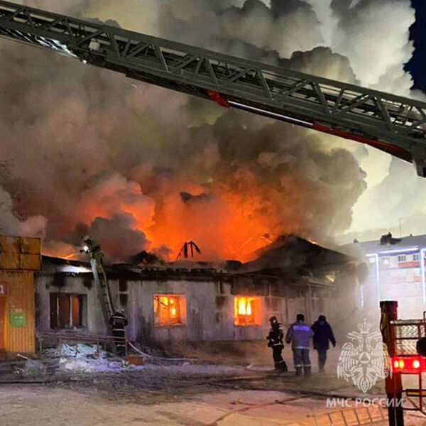 В ведомстве рассказали, что о возгорании в 1-м микрорайоне поселка городского типа стало известно в 12:55 (10:55 мск). Огонь распространился на 500 кв. м, к его тушению привлекли дополнительных пожарных. Вскоре в здании обрушилась крыша.
