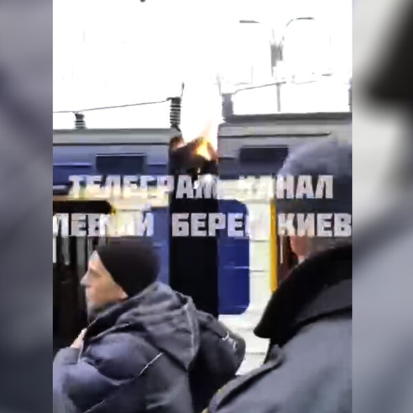 Очевидцы опубликовали видео, на котором на крыше вагона видна фигура человека в огне. Сообщается, что ЧП произошло на экспрессе, следующем до Киева.