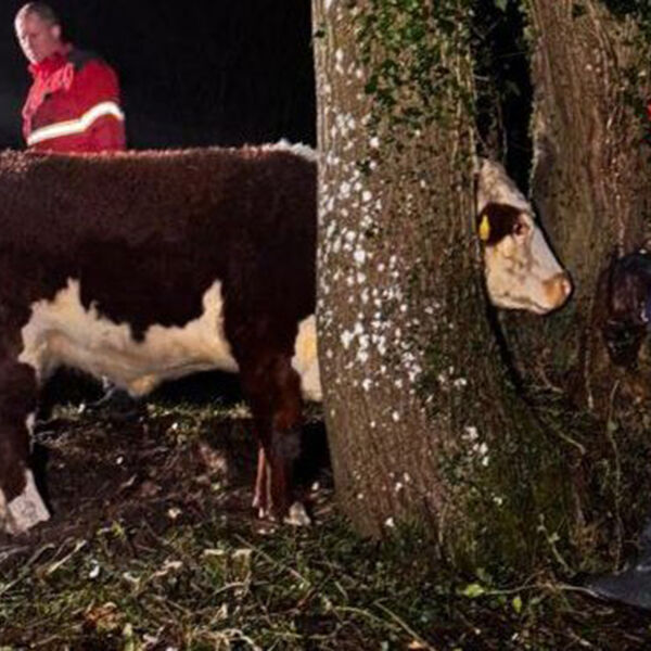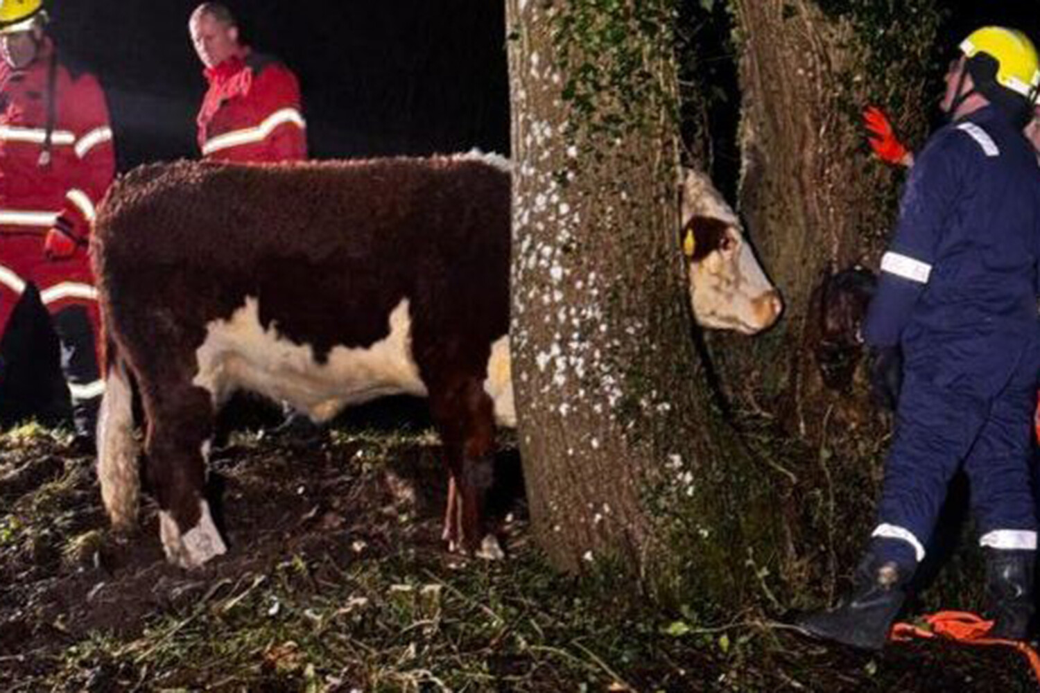 Чтобы аккуратно освободить корову, спасатели использовали телескопический погрузчик. Животное подняли на уровень, где расстояние между двумя ясенями было больше, после чего его удалось безопасно извлечь.