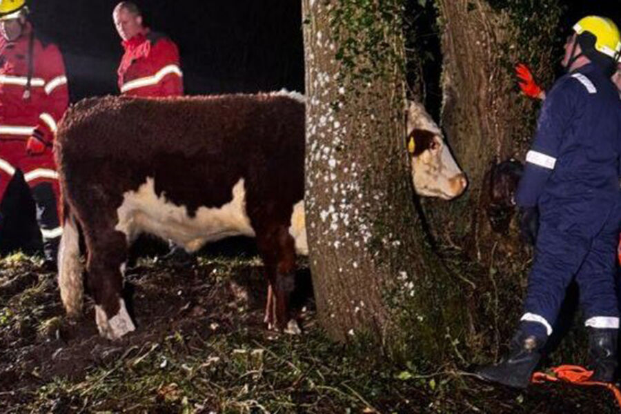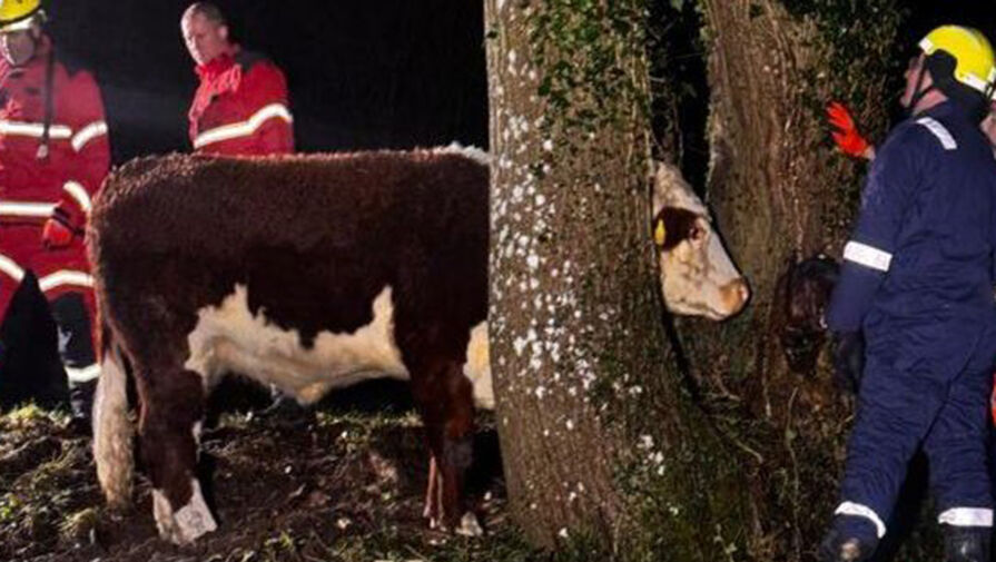 Пожарные в Англии провели необычную спасательную операцию, объединив усилия с ветеринаром, чтобы освободить корову, застрявшую головой между двумя деревьями, пишет UPI.