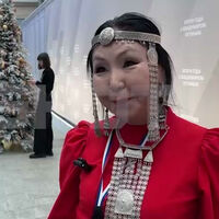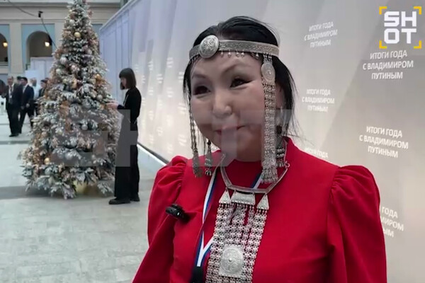 Корреспондентка предстала перед камерами в ярко-красном наряде и рассказала, что для встречи с президентом выбрала национальные украшения — бастынгу, илин кэбиьэр и косоплетку, которые изготовили из ложек.