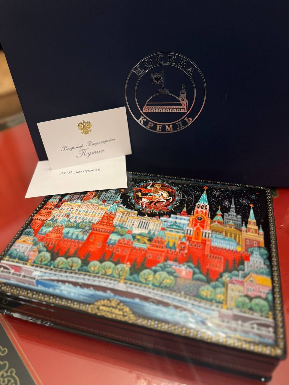 На фотографии показана подарочная коробка с логотипом со словами «Москва» и «Кремль», а также сама шкатулка. На ней изображен Кремль и Георгий Победоносец. Рядом карточка с подписью «Владимир Владимирович Путин» и, предположительно, конверт, адресованный «М.В. Захаровой».