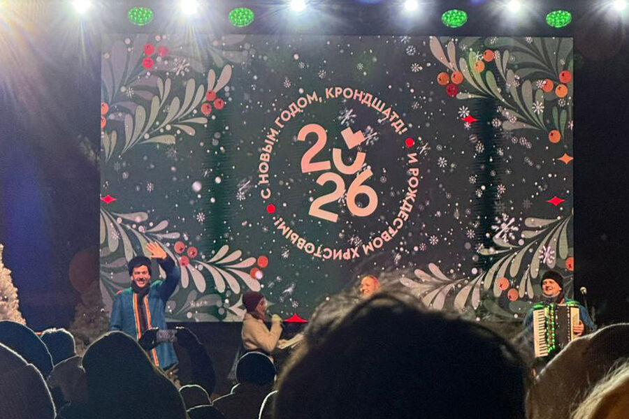 В пятницу, 26 декабря, на центральной площади Кронштадта прошло мероприятие под названием «В ожидании чуда!», организованное местной администрацией. Сцену оформили праздничным баннером с новогодним поздравлением для горожан.