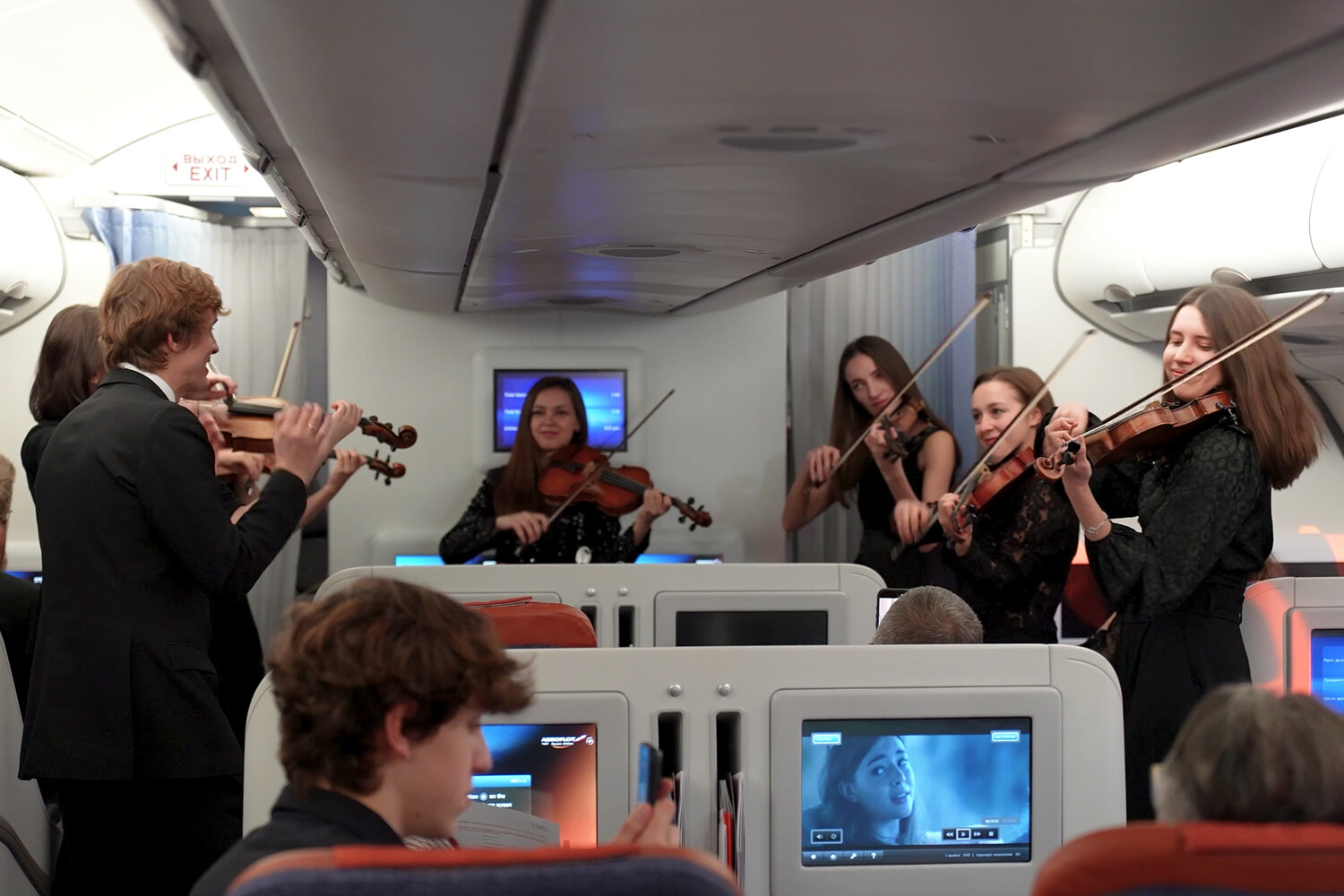 Уточняется, что в рамках инициативы музыканты перед полетом выступили с большим концертом перед пассажирами московского аэропорта «Шереметьево», затем дали живой камерный концерт на борту воздушного судна.