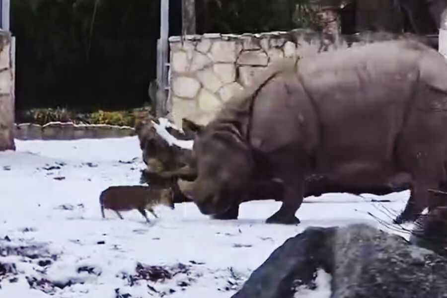 В вольере Вроцлавского зоопарка мелкий олень мунтжак, весом не более 10 кг, напал массивного носорога по кличке Марушка весом 1,7 тонн. Видео забавного случая опубликовала пресс-служба заведения в социальной сети Х.