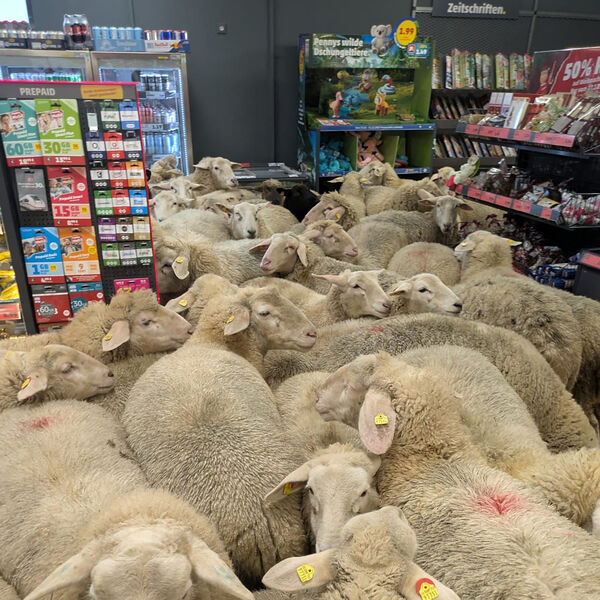 Инцидент произошел 5 января в баварской общине Бургзинн. Около 50 овец и ягнят отстали от основного стада во время перегонки и забежали в открытый супермаркет. Очевидцы сняли на видео, как животные перемещаются по магазину. Вывести их обратно на улицу удалось примерно через 20 минут.