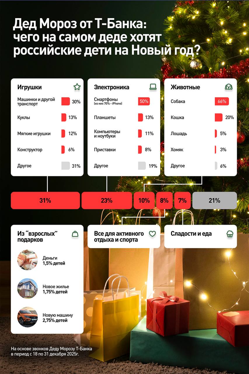 За новогодний сезон 2025-2026 ИИ-Деду Морозу от Т-Банка поступило 522 тыс. звонков, чаще всего дети просили у новогоднего волшебника смартфоны, игрушки и собаку, реже всего – деньги. На них приходится всего 1,5% загаданных желаний, следует из сообщения Т-Банка по итогам работы сервиса.
