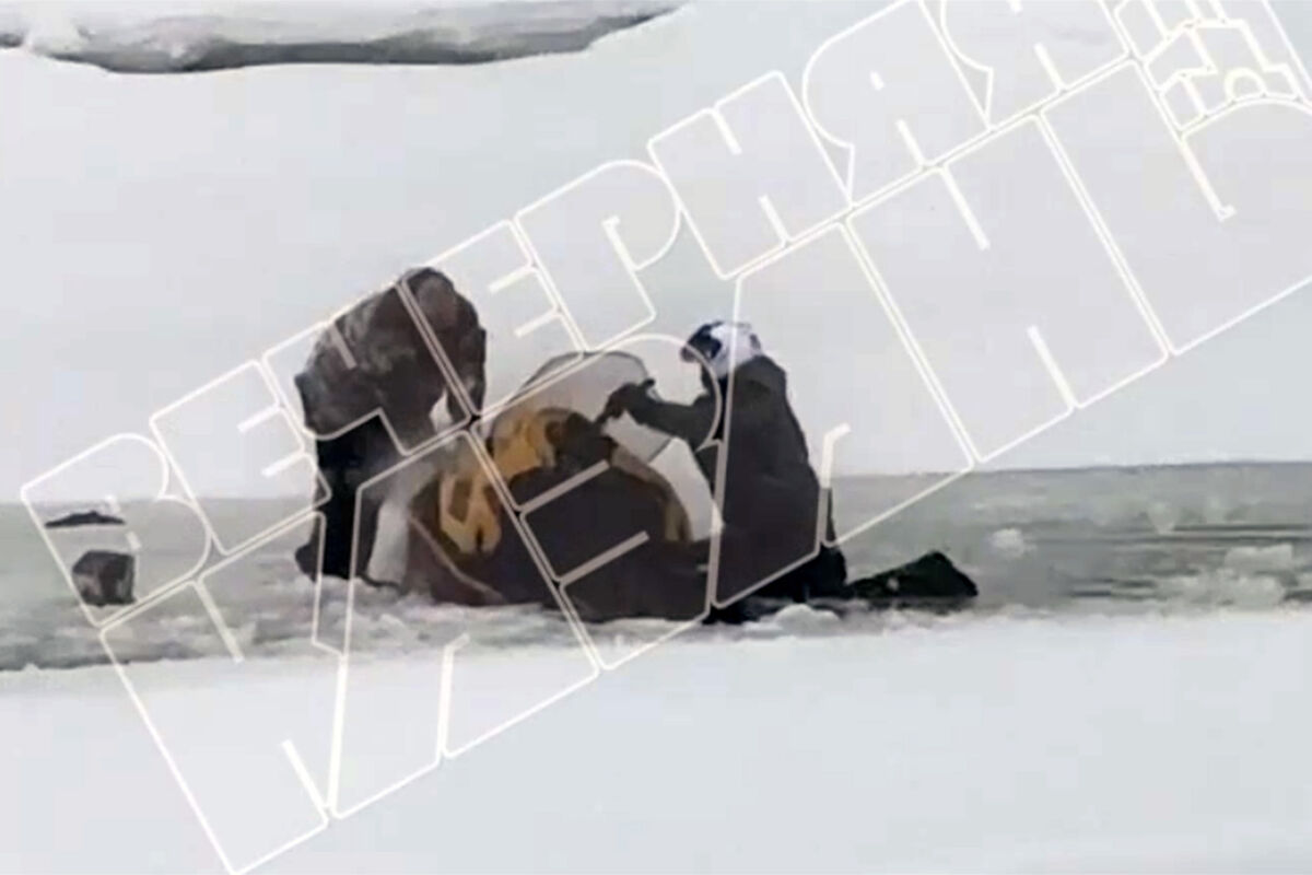 Судя по записи, сделанной очевидцами, мужчина, управлявший снегоходом, и его пассажир не пострадали и до последнего пытались вытащить транспортное средство из полыньи на реке Казанка.