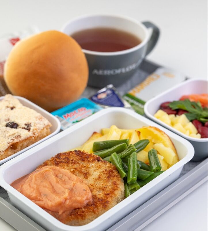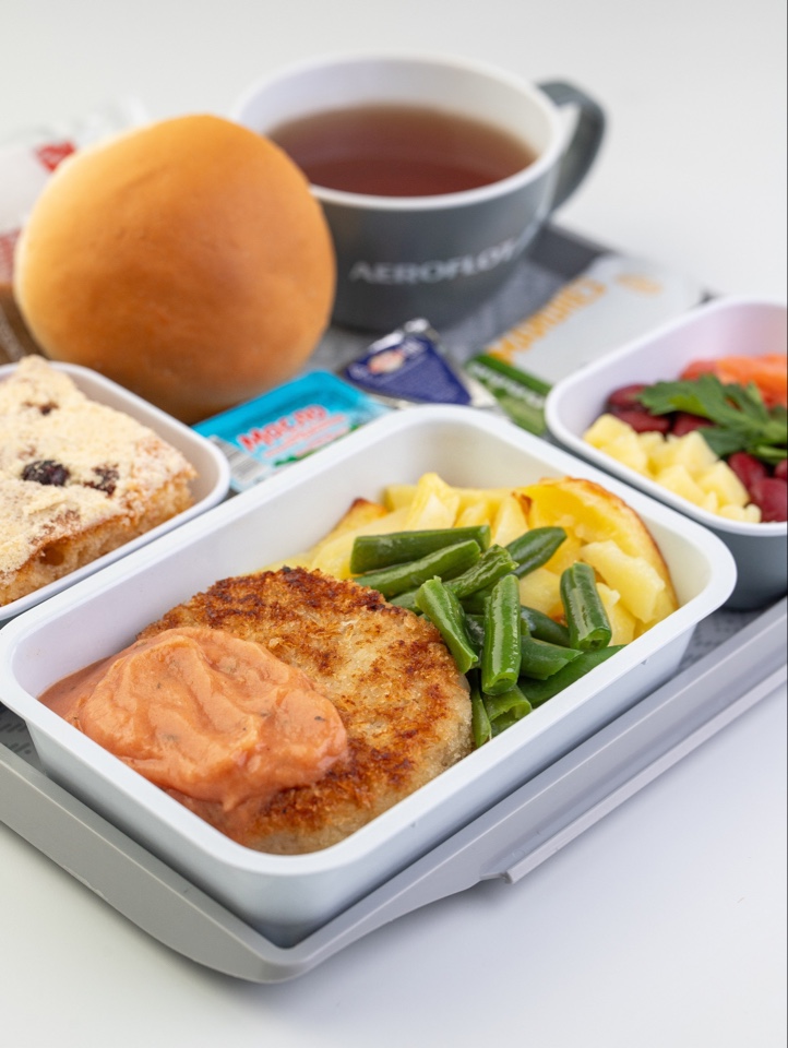 В зависимости от направления и продолжительности полета в меню представлены котлета из индейки с жареным картофелем, фасолью и сливочно-томатным соусом, пикша с картофельным пюре, морковью и соусом тартар, говядина в соусе демиглас с гречкой и брокколи, а также баранина в бальзамическом соусе с картофелем по-деревенски и морковью.