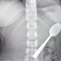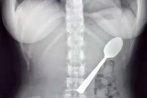 Врачи предупредили, что такая большая ложка не выйдет естественным путем, и назначили гастроскопию через два дня. Под местной анестезией ее повернули в желудке и удалили.