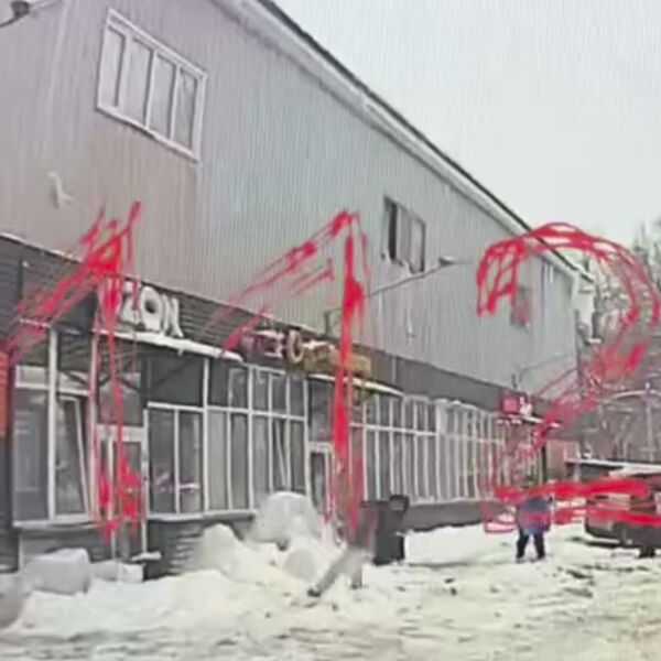 По словам местных жителей, снег и лед регулярно сходят с крыши этого дома. Кроме того, они утверждают, что козырьки у входов в магазины выглядят ненадежными.