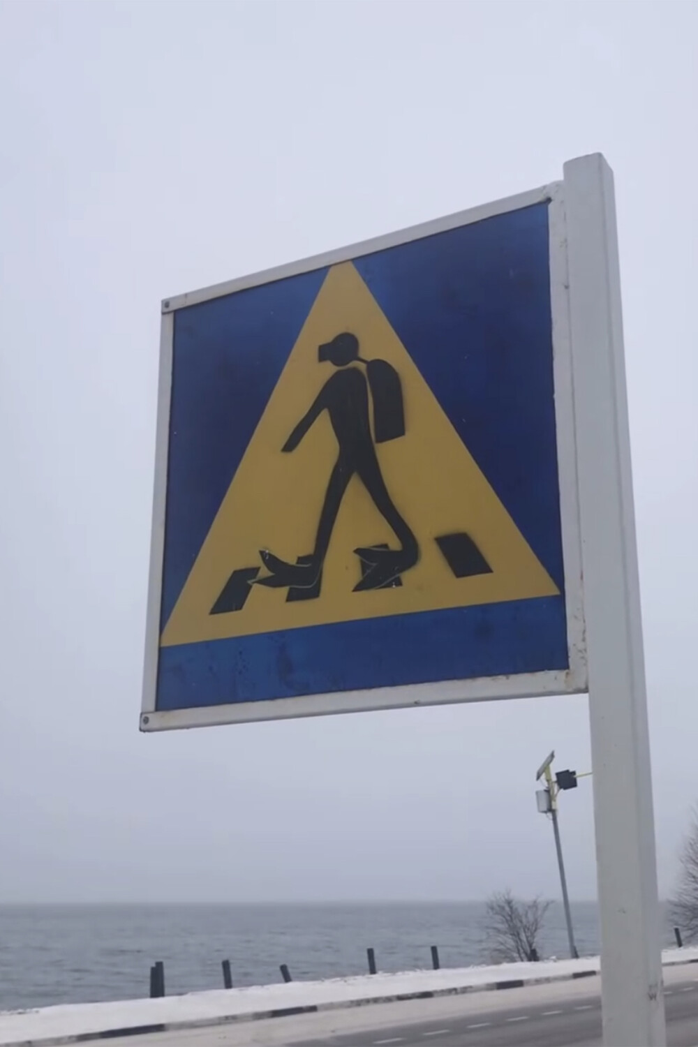 Пародию на знак пешеходного перехода с идущим по «зебре» аквалангистом поставили на обочине дороги в рабочем поселке Листвянка Иркутского района неподалеку от дайвинг-центра «Байкал — Фартовый».