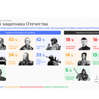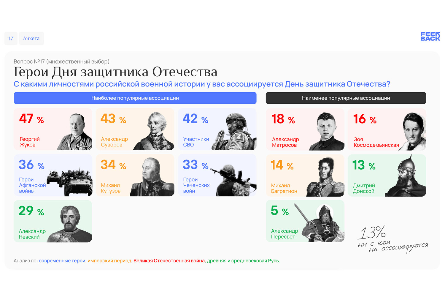 В целом День защитника Отечества в общественном сознании прежде всего связан с современными героями (111% суммарно) и военными личностями периода Российской империи (91% суммарно). При этом 3% участников опроса в свободных ответах связывают этот день с близкими, прошедшими войну. Маршал Георгий Жуков возглавил рейтинг героев 23 Февраля — его выбрали 47% половина россиян. Популярны также оказались великий русский полководец Александр Суворов и действующие участники СВО.