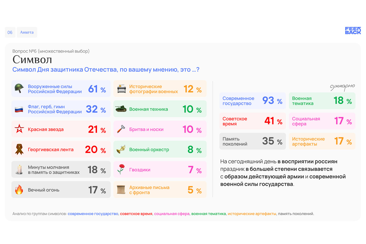 Праздник чаще всего ассоциируется с действующей армией — этот образ называют 61% опрошенных. Также среди ключевых символов государственная символика — флаг, герб и гимн Российской Федерации (32%) и Красная звезда (21%).