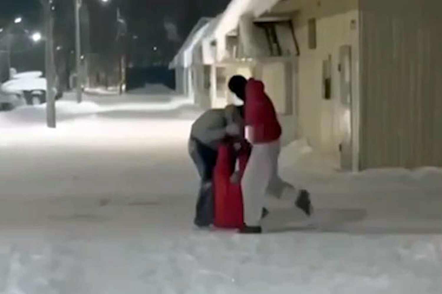 Инцидент произошел поздним вечером в Тихвине. На кадрах видно, как четверо подростков в балаклавах по очереди бьют руками и запинывают ногами жертву в красной куртке.
