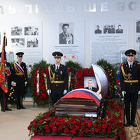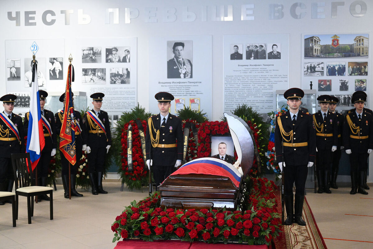 В Москве проходит прощание со старшим лейтенантом Денисом Братущенко, который погиб при взрыве у Савеловского вокзала. Кадры с траурной церемонии публикует Telegram-канал 112.