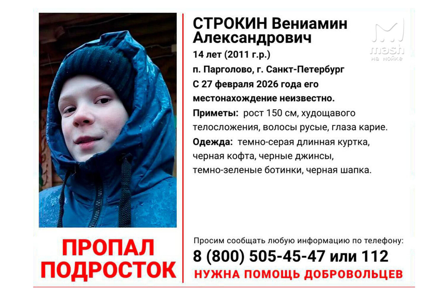 Инцидент произошел 27 февраля. Школьник вышел из дома, чтобы выбросить мусор, и при этом не взял с собой мобильный телефон. Обратно он уже не вернулся, однако позже его видели с другом в компьютерном клубе. Приятелям он не сказал, куда собирается идти дальше.