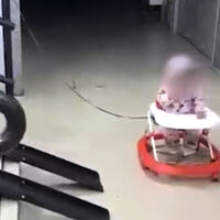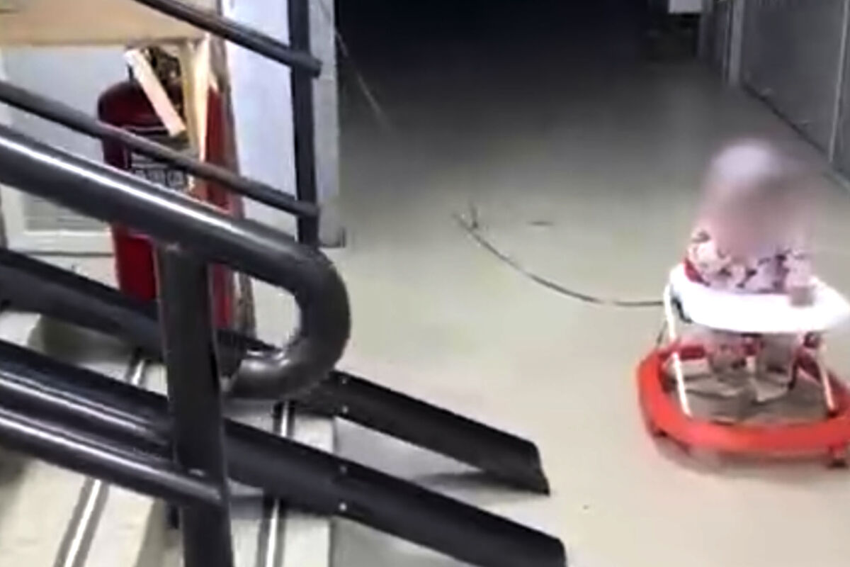 Посетители одного из городских торговых центров заметили девочку на ходунках, которой на вид от года до полутора лет. При этом ребенок привязан и кружит вокруг перил.
