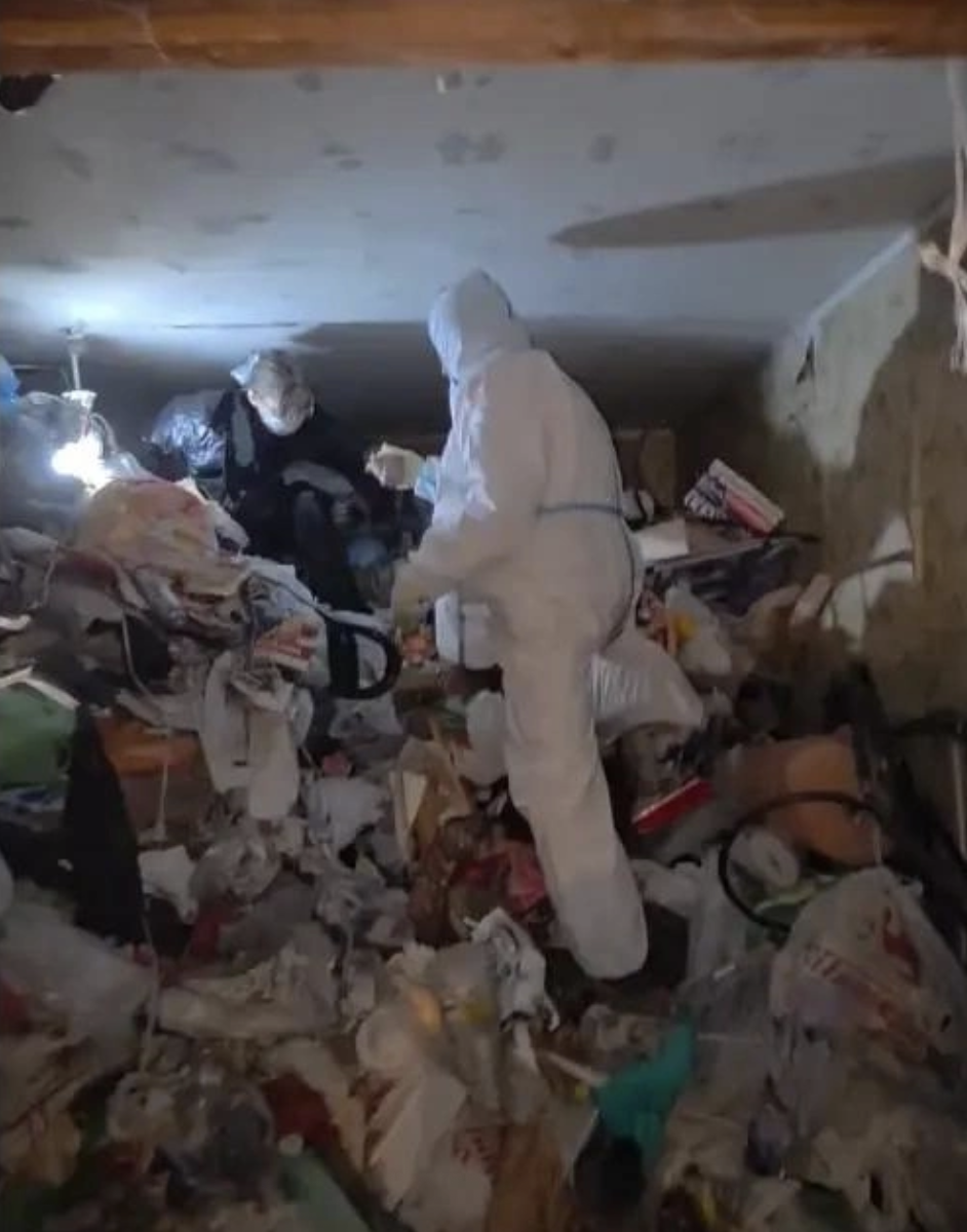 В квартире проводили санитарную обработку силами местных коммунальных служб, неделю назад в захламленных комнатах нашли пенсионерку, спасти ее не смогли.