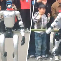 Внезапно он резко повернулся к толпе с вытянутыми руками и ударил ребенка по лицу. Операторы тут же вмешались, пытаясь оттащить машину, но та продолжила вращаться и махать металлическими конечностями.