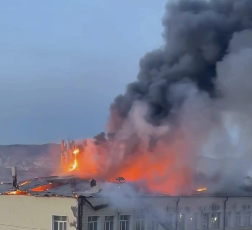 Telegram-канал «Весь Улан-Удэ» опубликовал кадры с места происшествия. На них видно, как сотрудники экстренных служб стоят на полыхающей крыше здания и пытаются ликвидировать пламя.