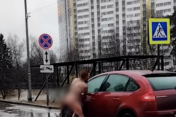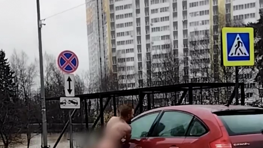 В Подмосковье голый мужчина оторвал зеркало у машины и попал на видео